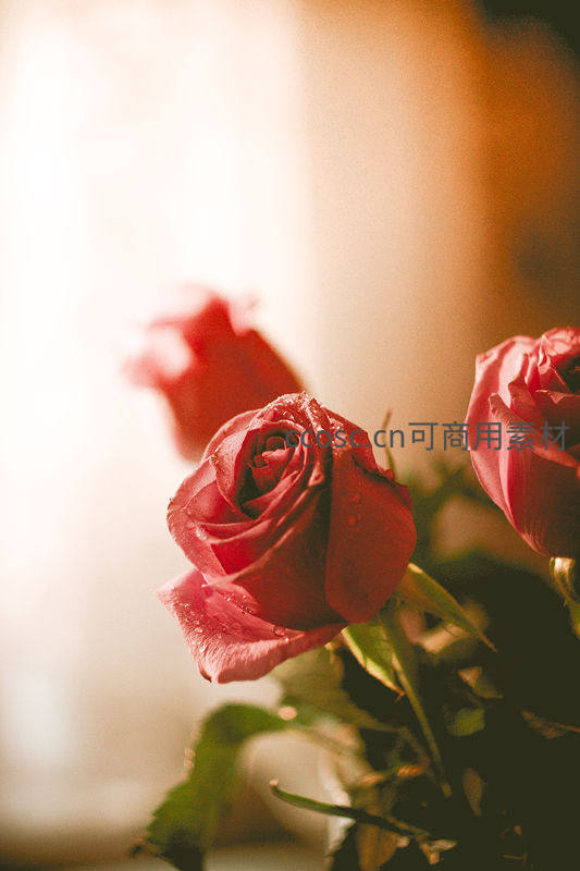 清晨的阳光温柔地洒在几朵红玫瑰上,花瓣上凝结着细小的水珠,绿叶在光晕中若隐若现,展现自然的鲜活与柔美。