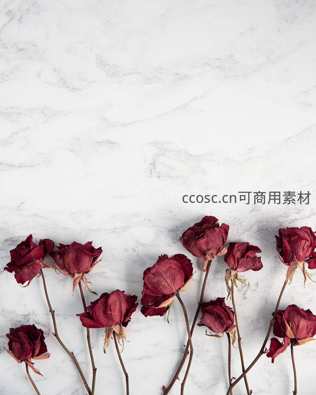 数枝干枯的深红色玫瑰散落在洁白的大理石台面上,花瓣卷曲褪色,与冷峻的石纹形成对比,无声诉说着时间与美的消逝。