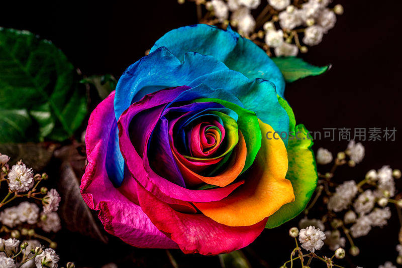 一朵色彩斑斓的彩虹玫瑰在深色背景下绽放,每片花瓣呈现不同颜色,周围点缀白色小花,营造奇幻而绚丽的视觉效果。