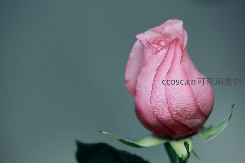 一枝含苞待放的粉红色玫瑰以侧面角度呈现,花瓣纹理清晰可见,搭配翠绿叶片,在素雅灰绿背景下更显温柔与期待。