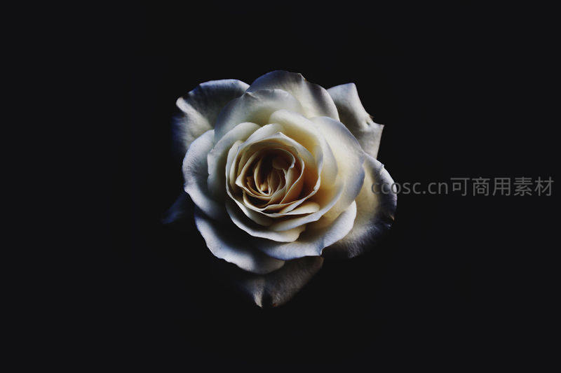 一朵洁白的玫瑰在纯黑背景下绽放,光影勾勒出花瓣的细腻纹理与层次,营造出静谧、优雅且略带忧郁的艺术氛围。
