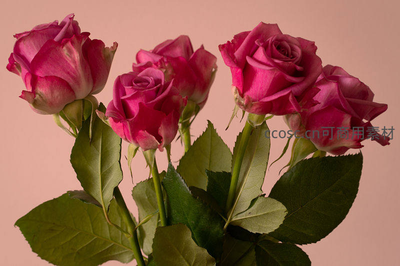 数朵饱满的粉红玫瑰与翠绿叶片相映成趣,在柔和的暖色背景中展现出蓬勃的生命力与温馨浪漫的节日氛围。