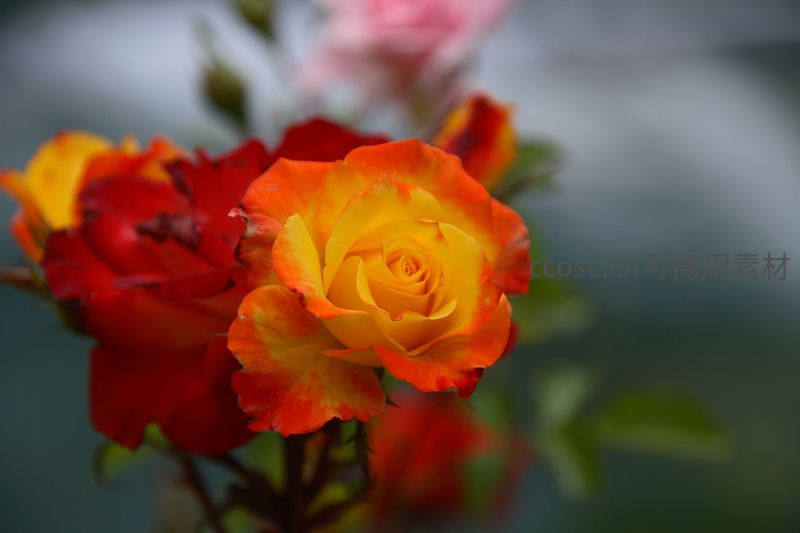 镜头聚焦于一朵黄红渐变的玫瑰,中心明亮黄色向外过渡为炽热红色,背景虚化突出主体,展现自然花卉的生动与美感。