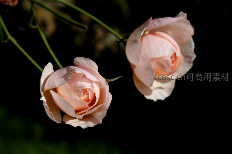两朵淡粉色玫瑰在纯黑背景下优雅绽放,柔和光线勾勒出花瓣的细腻纹理,营造出静谧、浪漫且富有艺术感的视觉体验。