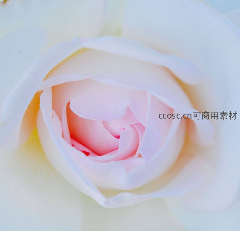 镜头深入玫瑰花心,粉白渐变的花瓣层层叠叠,在柔和光线下如梦境般纯净浪漫,细腻纹理与朦胧光晕共同营造温柔氛围。