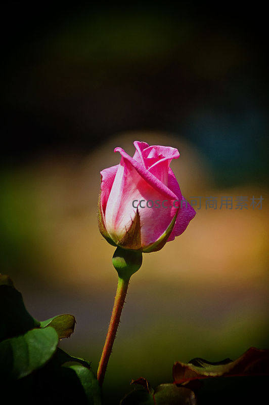 一枝娇嫩的粉色玫瑰花蕾在阳光下静静伫立,绿叶衬托,背景朦胧,象征着生命的萌动与未来的无限美好与希望。