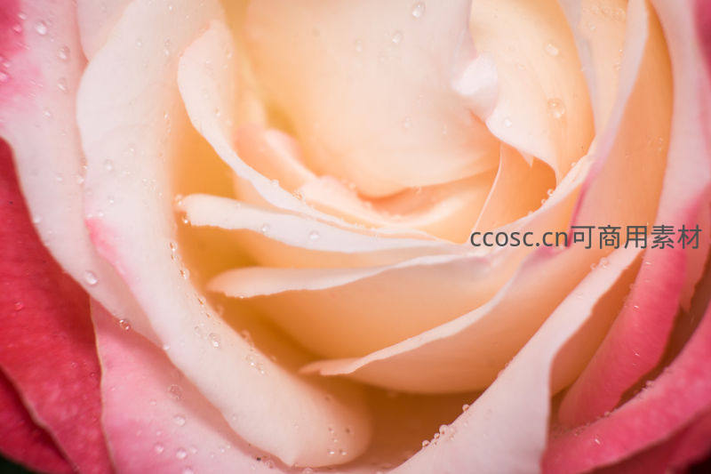 粉橙渐变玫瑰花瓣上的晨露特写