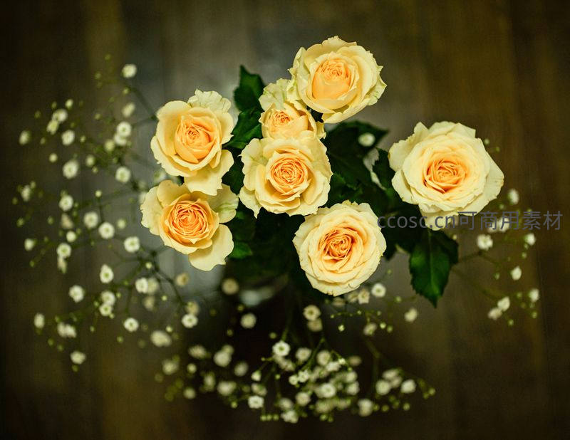 一束盛开的淡黄色玫瑰搭配洁白的满天星,绿叶衬托,置于温暖木质背景前,营造出宁静、温馨而富有诗意的氛围。