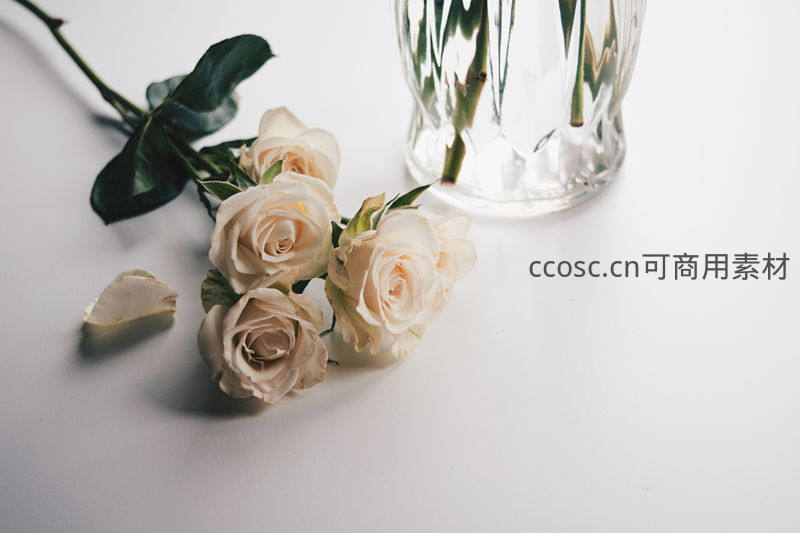 几朵奶油白色的玫瑰散落在纯白背景上,旁边是透明刻面玻璃花瓶,整体画面简洁宁静,充满现代家居的清新美感。