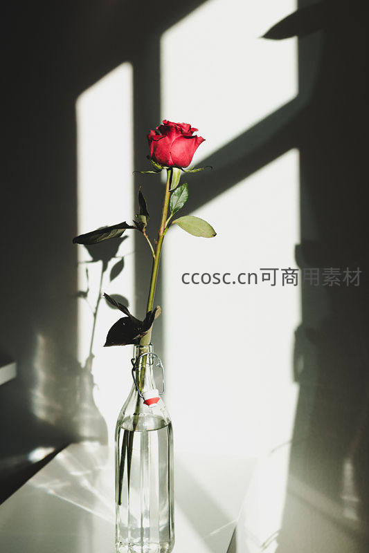 一支鲜红玫瑰插在透明玻璃瓶中,阳光透过窗户投下几何光影,营造出静谧而富有诗意的艺术氛围,象征着纯粹的爱与思念。