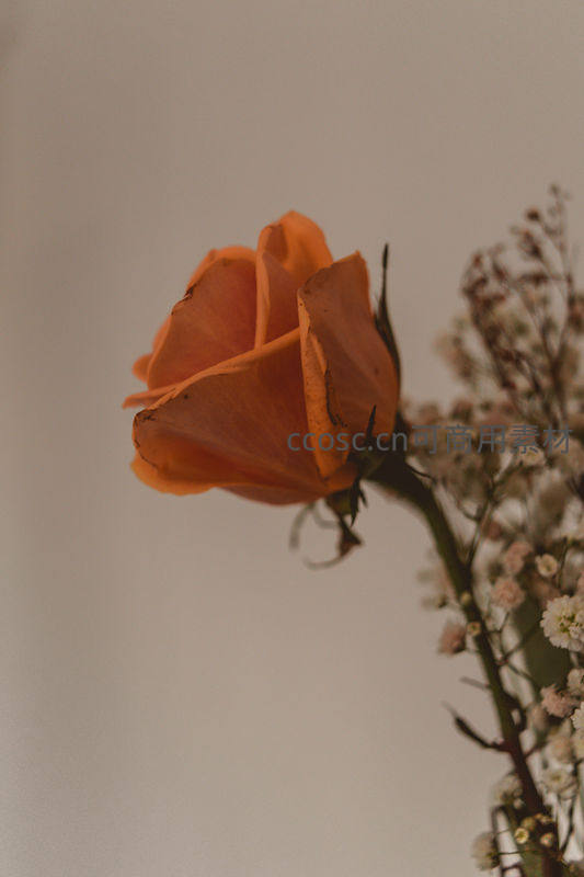 一支略带枯萎痕迹的橙色玫瑰,在柔和的复古光线下静静绽放,旁有满天星点缀,营造出一种温柔而怀旧的氛围。