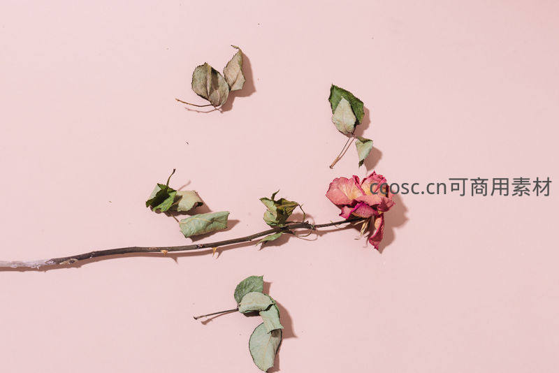 一支枯萎的玫瑰横卧在柔和的粉色背景上,花瓣与叶片已干枯卷曲,呈现出时光流逝的静谧美感。