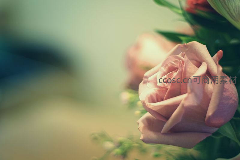 一朵粉嫩的玫瑰在柔和光线下绽放,背景虚化营造出梦幻氛围,细腻的花瓣纹理传递着温柔与浪漫的气息。