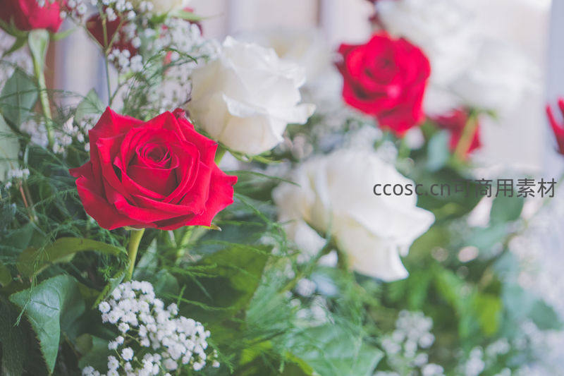鲜艳的红玫瑰与纯洁的白玫瑰交织成束,点缀着细碎的满天星,象征着热烈与纯净交织的爱情与祝福。