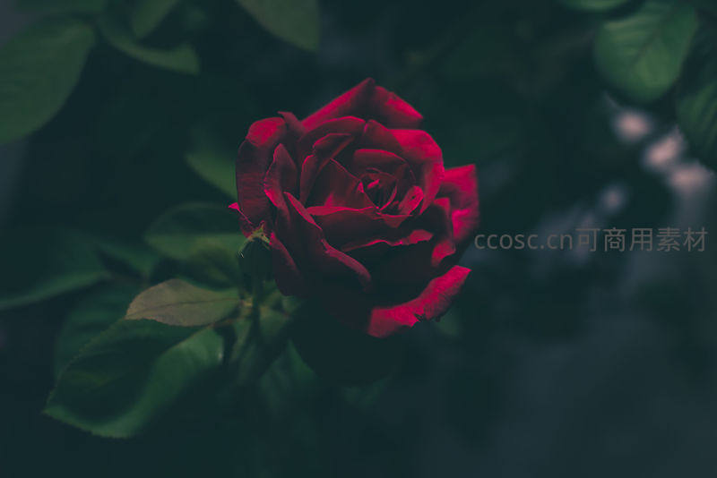 暗调花园中的深红玫瑰