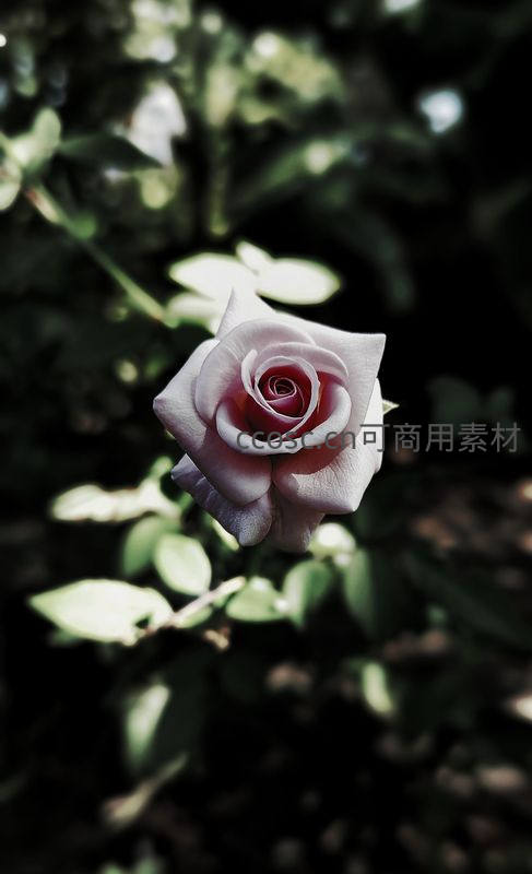 一朵洁白的玫瑰花蕾在深绿色叶片的衬托下悄然绽放,背景虚化营造出梦幻氛围,尽显自然之美。