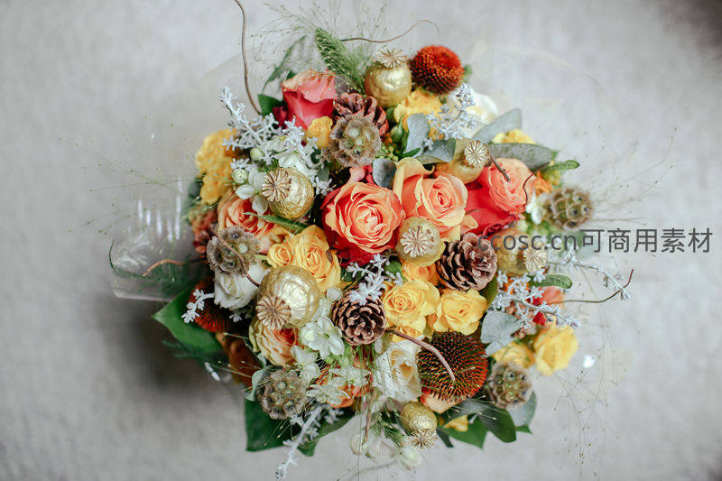 一束充满秋日气息的婚礼捧花,橙黄玫瑰搭配松果与银色装饰,洋溢着温暖与喜庆氛围。