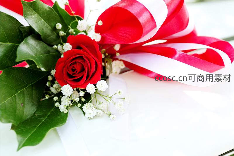 一朵鲜艳的红玫瑰搭配绿色叶片和白色满天星,缠绕着红白相间的绸缎丝带,充满浪漫与庆典气息。