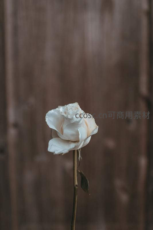 一朵略显凋零的白玫瑰立于斑驳木墙前,花瓣微卷,传递出岁月流逝与静谧怀旧的情感意境。