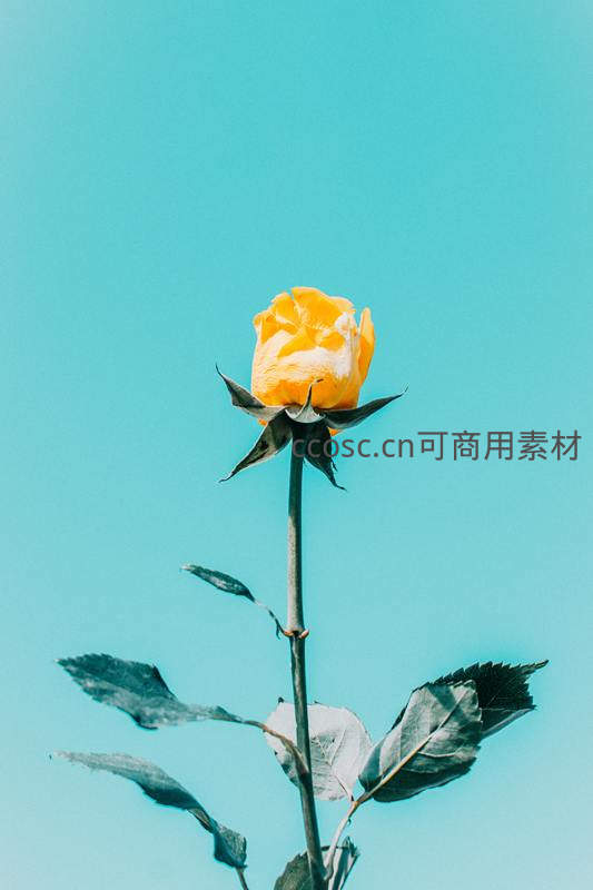 一朵娇嫩的黄玫瑰在纯净的蓝色背景下亭亭玉立,花瓣微卷,茎叶舒展,展现出自然的优雅与生命力。