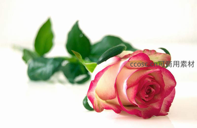 一支边缘泛红、中心洁白的玫瑰静置于纯白平面之上,绿叶相伴,构图简洁,尽显高雅与宁静之美。