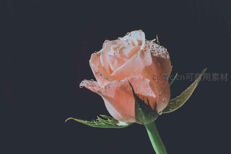 一朵娇嫩的粉玫瑰在深色背景下绽放,晶莹水珠点缀其上,绿叶与花茎清晰可见,尽显自然之美与细腻质感。