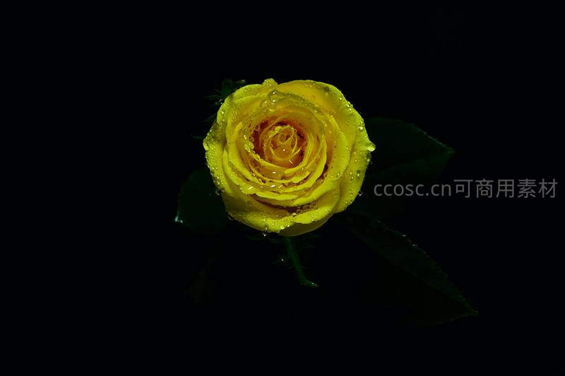一朵娇嫩的黄色玫瑰在纯黑背景下熠熠生辉,花瓣上晶莹水珠反射光芒,衬托出花朵的鲜活与纯粹之美。