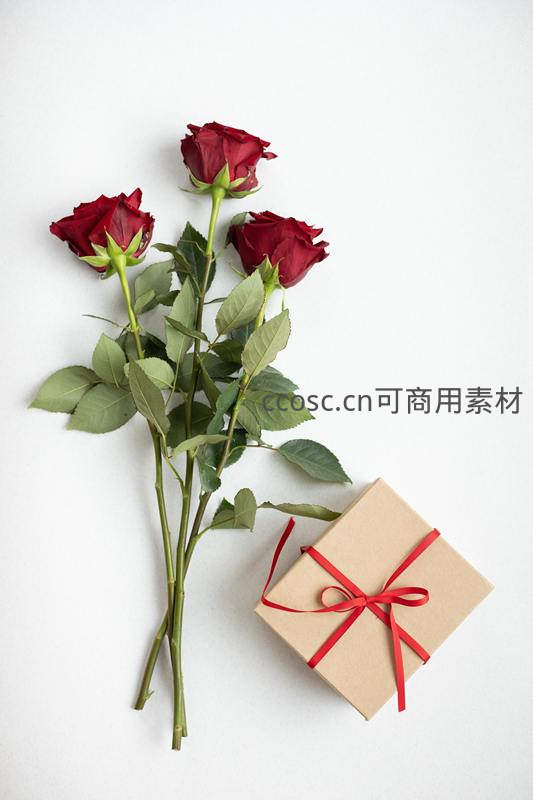三朵红玫瑰与礼盒并置,纯白背景显雅致