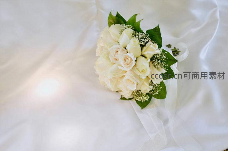 一束由白色玫瑰与满天星组成的新娘手捧花,安放于柔滑白绸之上,象征纯洁爱情与幸福婚姻的开始。