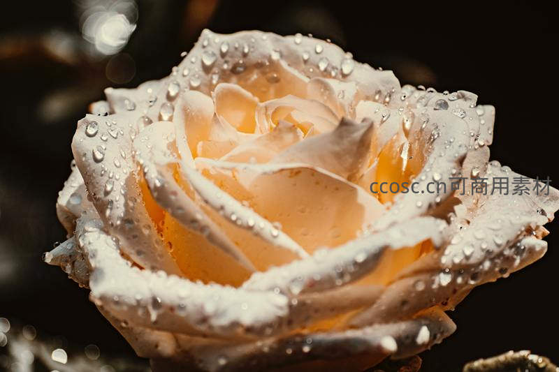 微距镜头下,一朵淡黄色玫瑰被晨露温柔覆盖,每一颗水珠都折射着柔和光线,展现花瓣的细腻纹理与生命之美。