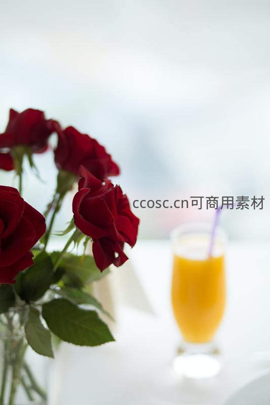 几枝娇艳的红玫瑰静静立于桌角,背景是一杯透亮的橙汁,阳光透过窗户洒落,构成一幅宁静惬意的午后生活画面。