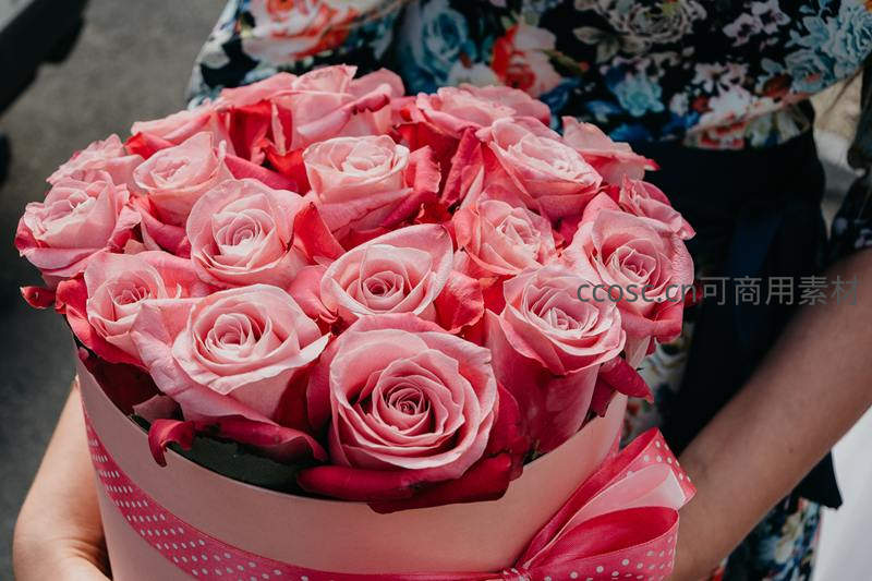 一双手捧着一个精美的圆形礼盒,里面满载层层叠叠的粉嫩玫瑰,系着波点丝带,是情人节或纪念日最甜蜜的礼物。
