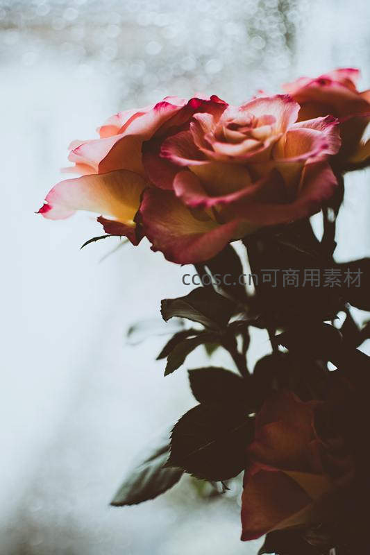 在柔和的逆光下,玫瑰花瓣边缘泛着温暖的光晕,深色的叶片形成剪影,整体画面充满朦胧而浪漫的艺术气息。