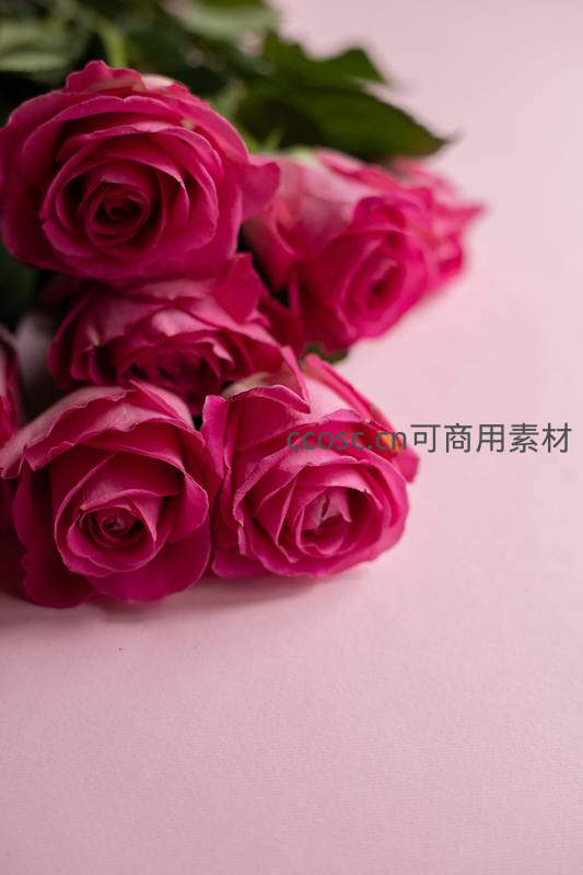 数朵深粉色玫瑰在浅粉色布面上簇拥绽放,色彩柔和统一,花瓣质感细腻,营造出浪漫温馨的氛围,是表达爱意与庆祝节日的理想选择。
