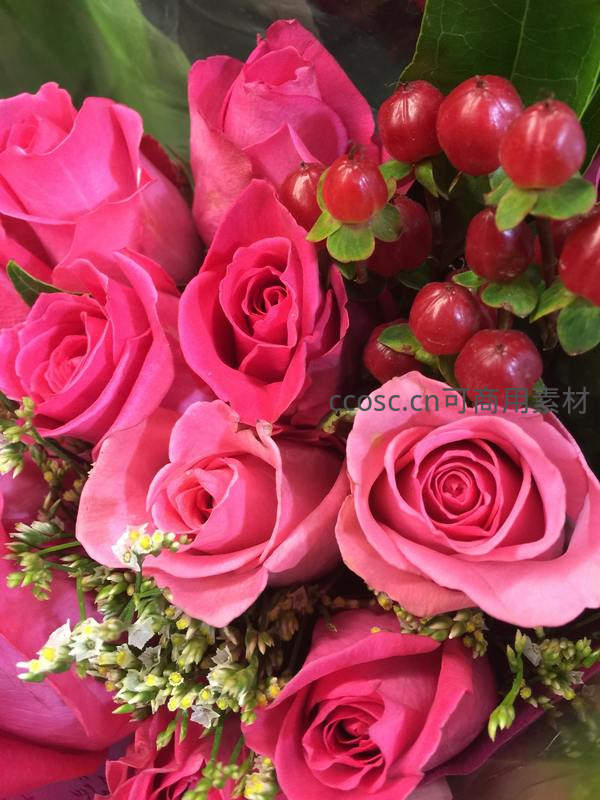 一束盛开的粉色玫瑰搭配鲜红浆果与嫩绿枝叶,色彩明快,层次丰富,充满生机与浪漫情调,是节日送礼的理想选择。