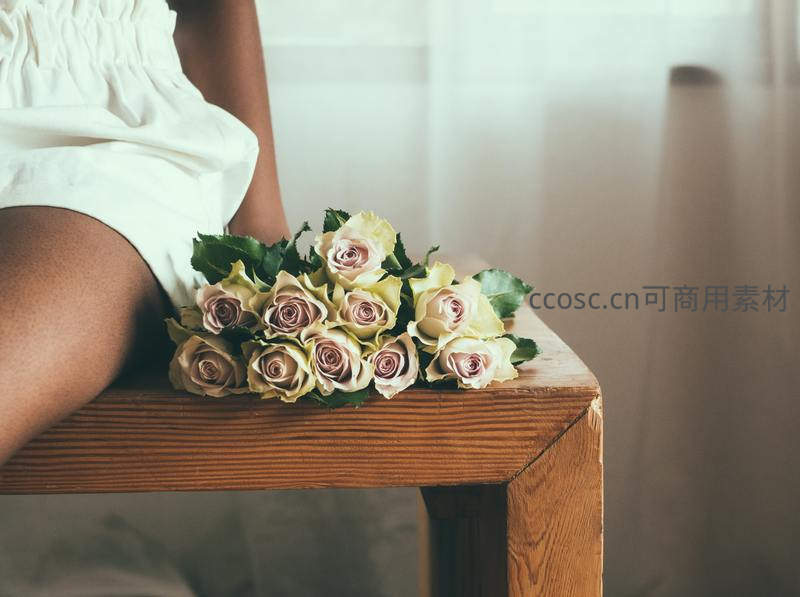 一束淡雅的香槟玫瑰安静地放在木质长凳上,旁边是穿着白色连衣裙的女子,柔和光线洒落,营造出宁静温馨的生活氛围。