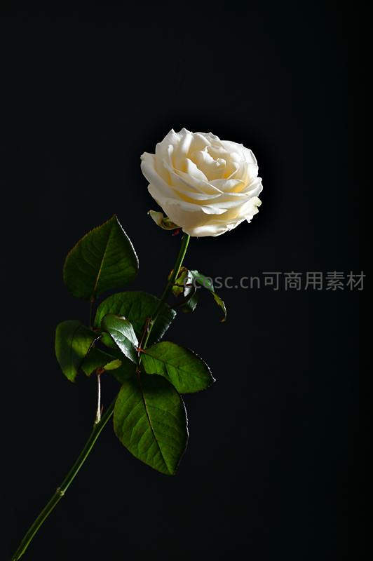 一朵洁白无瑕的玫瑰在纯黑背景中独自绽放,绿叶衬托,光线勾勒出花瓣轮廓,呈现出极致的简约、纯净与高贵的艺术美感。