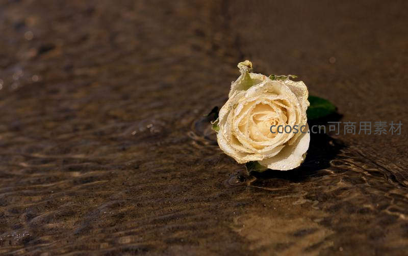 一朵凋零的白玫瑰静卧于微漾的水面,花瓣边缘卷曲泛黄,水波轻抚其身,营造出一种宁静而略带忧伤的氛围。
