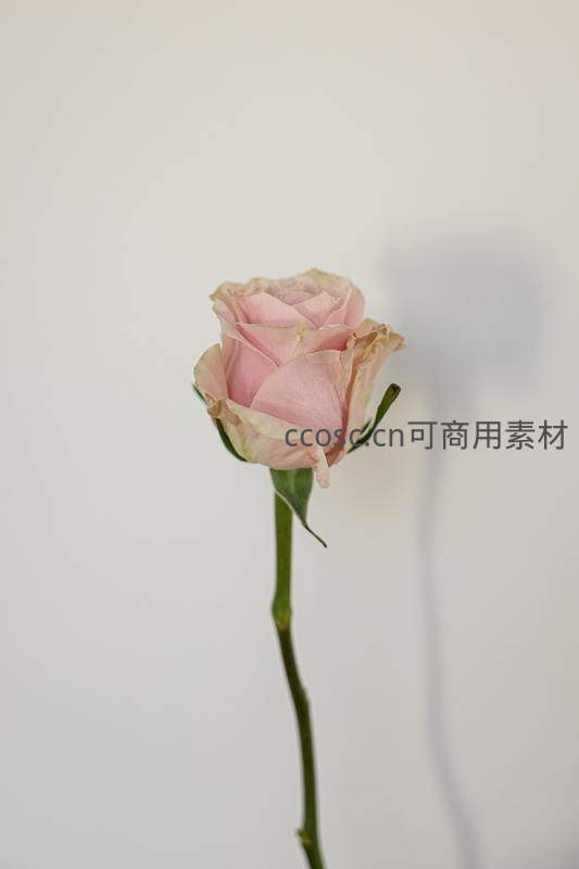 一支淡粉色玫瑰在纯白背景前静静绽放,花瓣略带枯萎感,绿茎挺拔,光影柔和,营造出宁静而略带忧伤的美感。