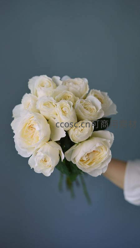 一只穿着白色袖子的手轻轻托起一束洁白无瑕的玫瑰花束,花朵层层绽放,背景是纯净的蓝灰色,整体画面传递出纯洁、温柔与浪漫的气息,适合婚礼或纪念日场景。