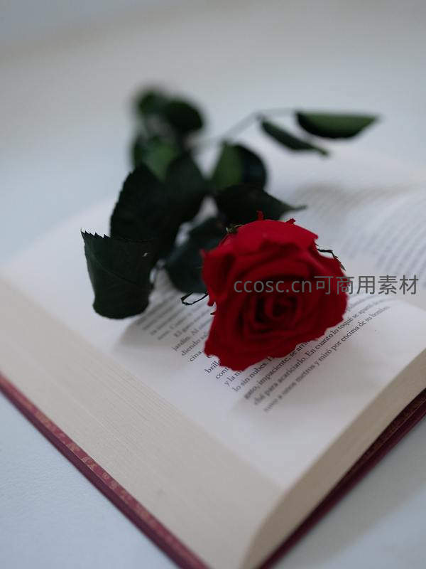 一朵盛开的红玫瑰轻放在一本摊开的书页上,绿叶点缀其间,象征着知识与爱情的交融,营造出宁静、雅致且富有文化气息的阅读时光。
