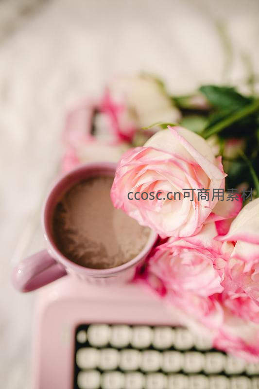 一杯热咖啡旁摆放着几朵柔美的粉白玫瑰,背景隐约可见粉色复古打字机,营造出一个慵懒、文艺又充满仪式感的清晨时刻。