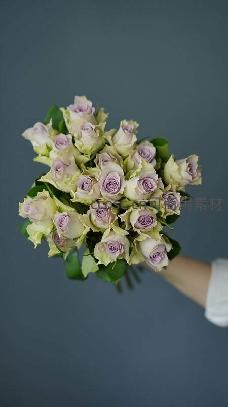一只手臂托举着一束紫心白边玫瑰,深灰背景突出花束的纯净与浪漫,适合作为婚礼、纪念日等场合的视觉元素。