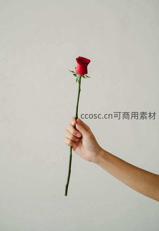 一只手在纯白背景下稳稳握住一支鲜红玫瑰,构图简洁有力,象征纯粹的爱意与专注的情感表达。