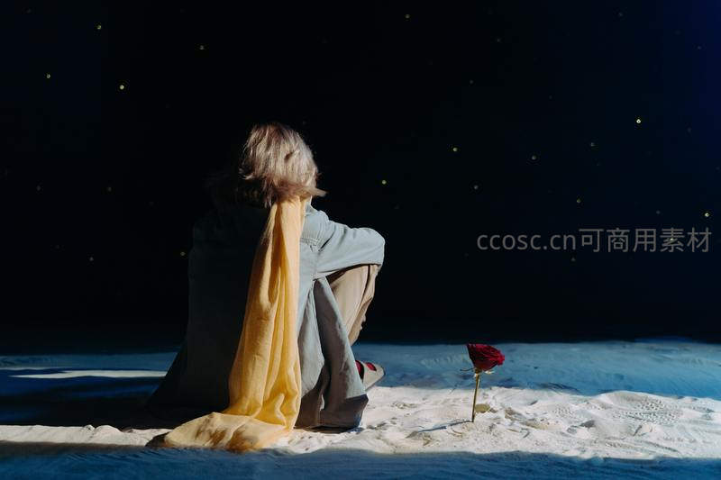 一人背对镜头坐在星光点点的“沙滩”上,身旁插着一朵红玫瑰,营造出诗意、孤独又充满想象空间的梦幻场景。