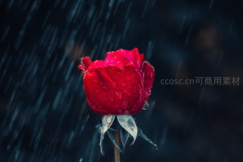 一朵鲜艳的红色玫瑰在倾盆大雨中傲然挺立,花瓣上挂满雨滴,背景模糊成流动的雨线,传递出一种坚韧又略带忧伤的诗意美感。