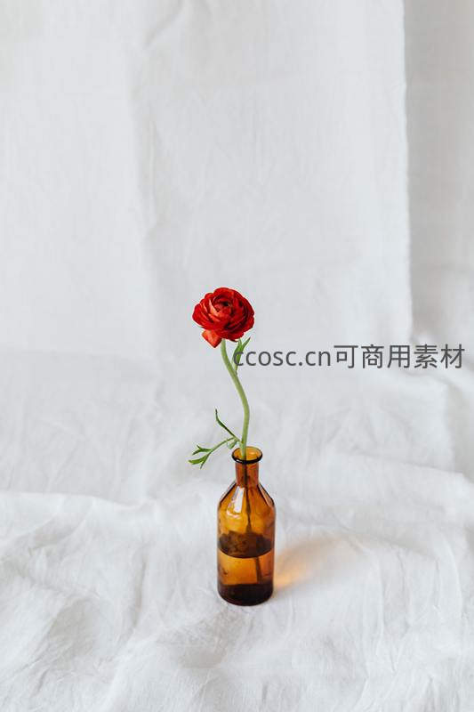 一支鲜艳的红色花朵插在复古棕色玻璃瓶中,置于纯白褶皱布景前,整体画面干净、宁静且充满艺术感。