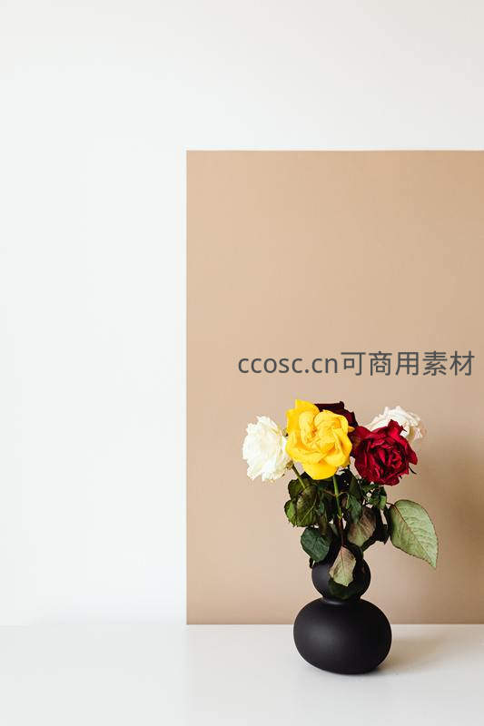 三色玫瑰聚黑瓶,撞色背景添现代艺术感