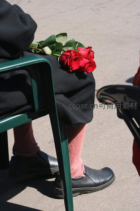 一位穿着黑色外套和粉色袜子的人坐在绿色塑料椅上,膝头静静躺着一束鲜艳的红玫瑰,在阳光照射下形成明暗对比,充满生活气息。