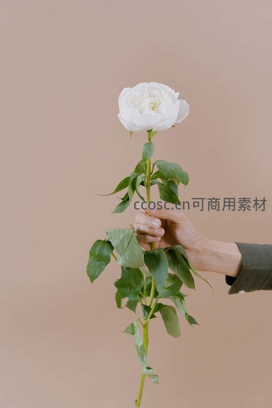 一只纤细的手轻轻托起一朵盛开的白色牡丹,背景是柔和的米色,绿叶垂落,整体画面干净而富有诗意,展现花朵的纯洁与柔美。